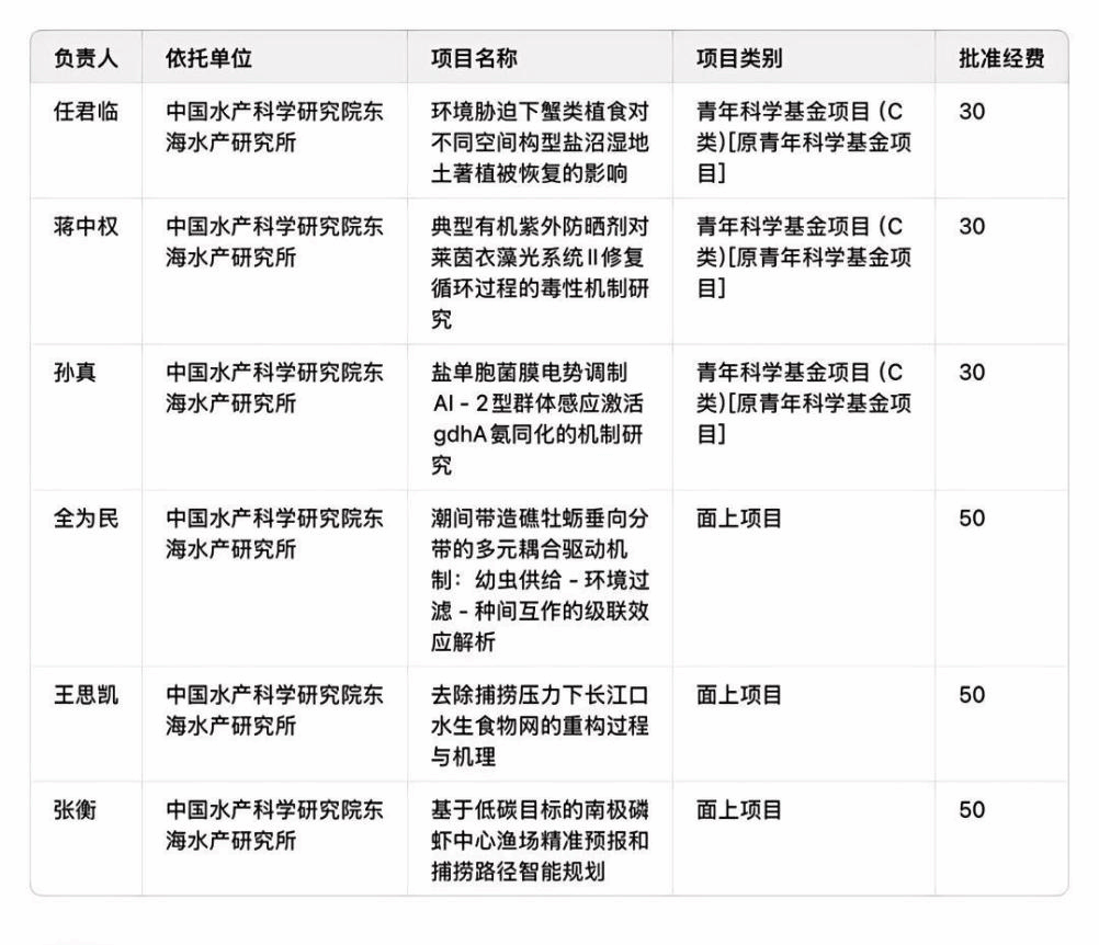 全为民研究员、王思凯副研究员、张衡副研究员主持的3个面上项目,分别围绕牡蛎垂带多元耦合机制、长江口水生食物网重构、南极磷虾渔场精准预报等关键领域展开研究,旨在深入解析海洋生态系统动态、应对气候变化挑战以及优化渔业资源管理,对解决水产养殖与渔业资源利用中的实际问题发挥关键作用,显著增强我所在水生环境保护与可持续利用方面的科研实力。青年骨干孙真助理研究员、任君临助理研究员、蒋中权助理研究员负责的3个青年科学基金项目,聚焦盐单胞菌膜电势调制、环境胁迫下蟹类植食、典型有机紫外防晒剂毒理等前沿研究方向,为我所在相关领域科研人才的成长与创新探索注入了新活力。