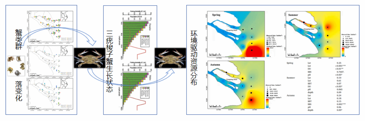 研究成果表明:(1)禁渔后长江口蟹类资源恢复成效显著,物种数恢复至14种(隶属9科),溶解氧和盐度是影响群落结构的关键因子,其中三疣梭子蟹成为绝对优势种;(2)长江口蟹类种群结构持续优化,三疣梭子蟹雌雄比稳定在0.68,甲宽范围扩展至17~175毫米,生长系数k值提升至1.2,异速生长指数趋近理想值。研究成果明确了环境驱动机制,广义加性模型表明,春季主要为溶氧和pH,夏季主要为溶氧,秋季主要为盐度和水深,不同因子与资源丰度呈现线性和非线性关系,揭示了长江口蟹类对栖息环境的敏感性。